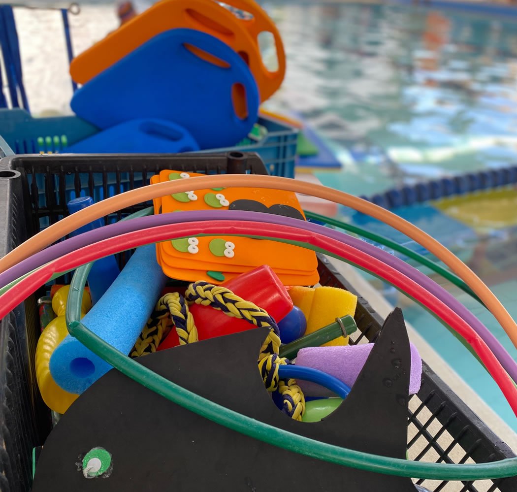 Uma piscina coberta especialmente projetada para bebês e adaptação, equipada com material pedagógico especial e área exclusiva para grupos e trios.