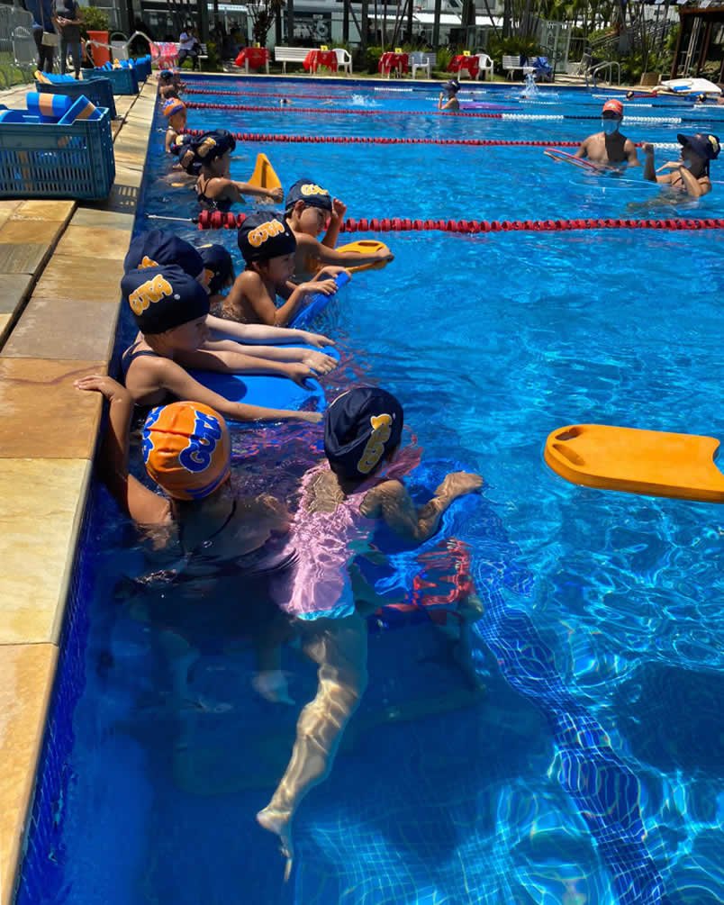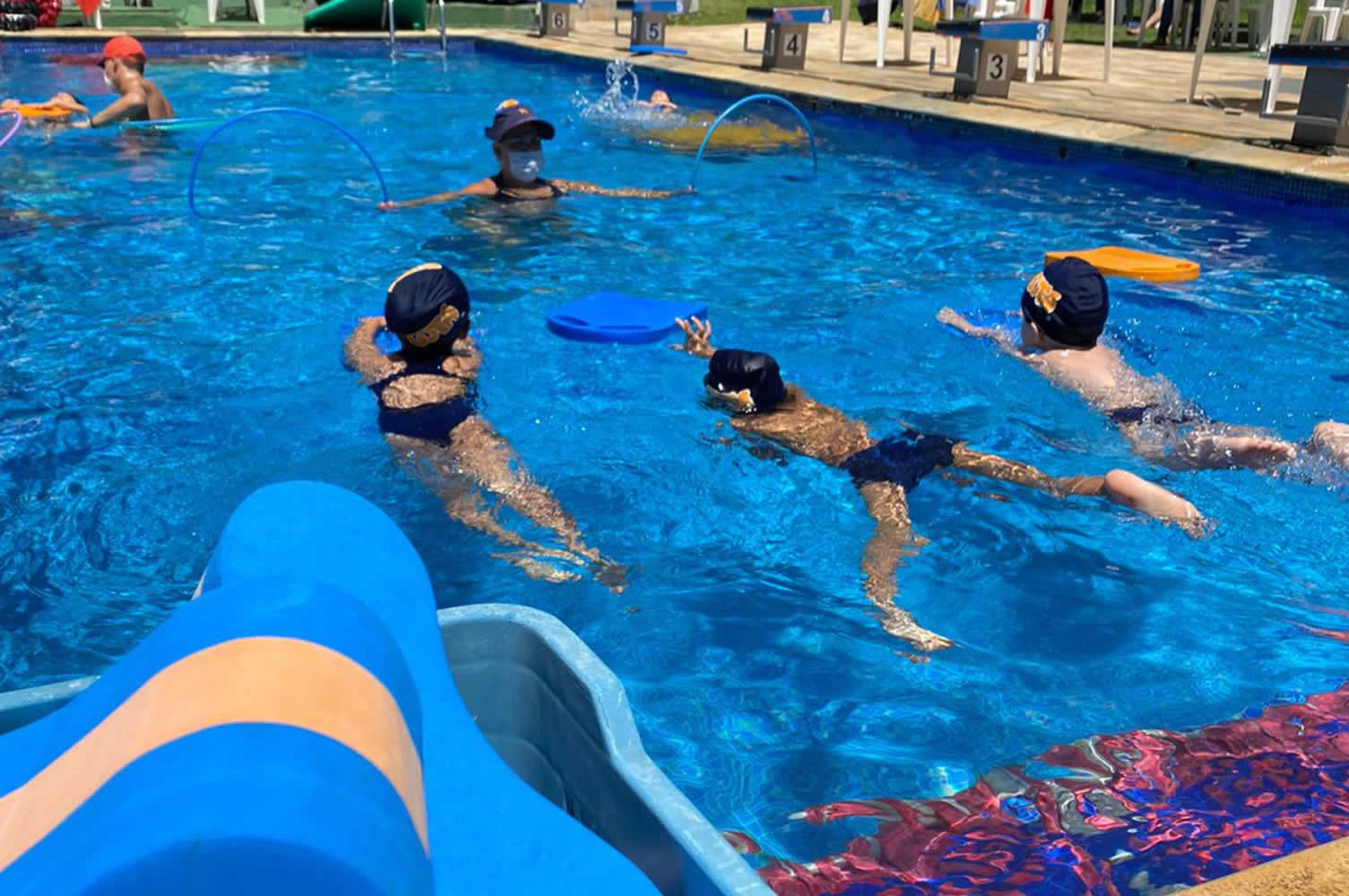 Uma piscina semi-olímpica (25m) aquecida e ozonizada, utilizada para aprendizagem, aperfeiçoamento, polimento e pela equipe oficial.